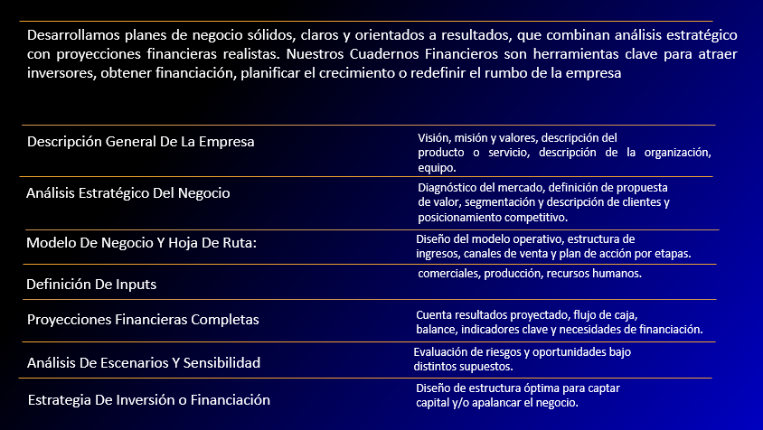 Desarrollamos planes de negocios sólidos, claros y orientados a resultados, que combinas análisis estratégicos con proyecciones financieras realistas. Nuestros cuadernos financieros son herramientas clave para atraer inversores , obtener financiación, planificar el crecimiento o redefinir el rumbo de la empresa